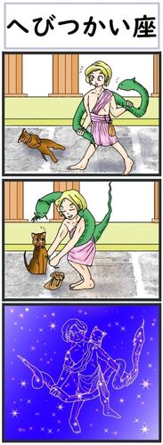 からす座のお話のその後。 『ほら、ここにも猫』・第283話です。 アポロンの子アスクレピオスは、死者をも生き返らせる腕を持つ医師であったので、ねこを生き返らせたこともあったようです。 へびが薬草で仲間を生き返らせることを知り、アスクレピオスは死…