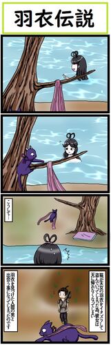仲間の天女が救出しにくる、とかはなかったようで。 『ほら、ここにも猫』・第398話です。 天界あるいは異界から来た娘と人間の男が夫婦になるというストーリーは、様々な国に伝わっているようです。 羽衣をまとえば、猫も空を飛べるのかも。